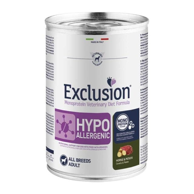 Exclusion Monoprotein Veterinary Diet Formula Hypoallergenic Cavallo e Patate 400gr è un’alimento completo monoproteico per il supporto nutrizionale del cane in caso di intolleranze alimentari;