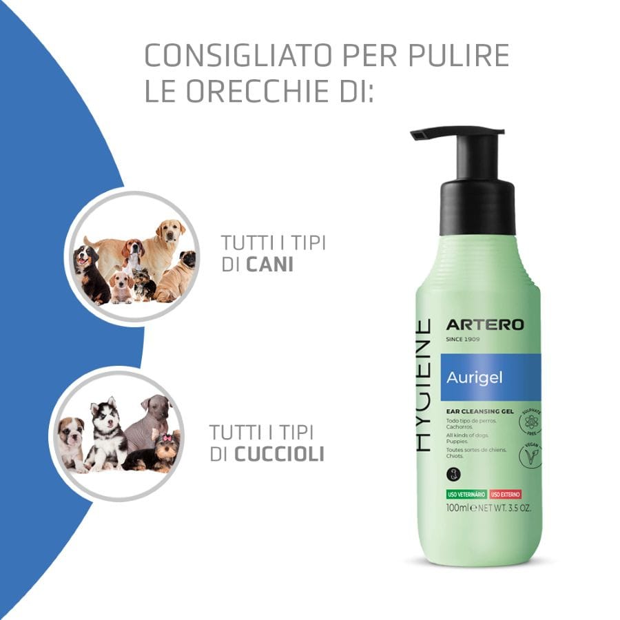 Questo gel a contatto con la pelle si liquefa, promuovendo una rapida penetrazione ed emulsificazione dell’eccesso di cerume e sporco. Grazie al suo tensioattivo non ionico estremamente delicato, pulisce rispettando l’equilibrio epidermico.Contiene ingredienti naturali  ed è adatto per cani di tutte le razze ed età;il prodotto aurigel di Artero non macchiaConfezione da 100 ml con dosatoreModalità d’usoApplicare la quantità sufficiente di gel auricolare per cani nel canale senza che trabocchi.Massaggiare la base dell’orecchio, in questo modo si favorisce l’emulsificazione con lo sporco e l’azione ceruminolitica.L’emulsione uscirà naturalmente verso l’esterno . Rimuovere con una salvietta o garza sterilizzata e asciutta.La frequenza d’uso è determinata dall’animale stesso. Generalmente, un’applicazione settimanale di Artero Aurigel è sufficiente per mantenere una buona igiene.Contiene, tra gli altri ingredienti:Tee Tree Oil, conosciuto popolarmente come “Albero del Tè Australiano”, con effetto germicida penetrante, batteriostatico e fungistatico. Antisettico naturale. Le sue qualità sanitizzanti e decongestionanti, con il suo effetto repellente per insetti e parassiti, lo rendono adatto come principio attivo nella formulazione di Artero AurigelPrecauzioni Attenzione speciale nell’area delle pieghe e solchi della cartilagine Non utilizzare cotton fioc, poiché potrebbe spingere lo sporco, con risultati opposti a quelli desiderati.Non adatto per gatti Importante:I nostri cosmetici Artero non contengono olio di visone.Artero è un’azienda impegnata nella protezione dell’ambiente. Oltre a prenderci cura della pelle e del pelo dei nostri animali domestici, ci preoccupiamo anche del benessere e del nostro ambiente. Utilizziamo imballaggi in alluminio e/o plastica PE o PET C nella nostra linea di prodotti Artero Cosmetics e Artero Complements.