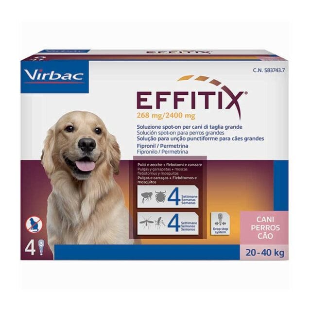Antiparassitario esterno, fialette per soli CANI da 20 a 40kg di peso corporeo , attivo per quattro settimane contro i parassiti (pulci, zecche, zanzare e flebotomi)