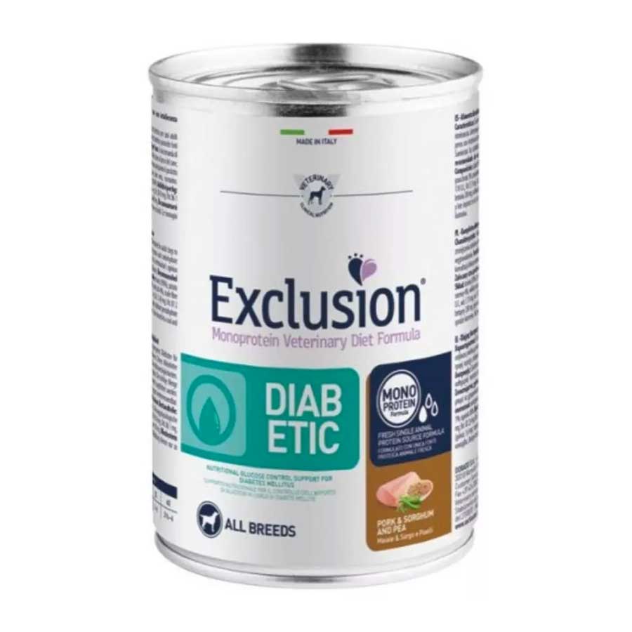 Exclusion Diabetic Pork Sorghum e Pea All breed 400gr è un’alimento con formula monoproteica per il supporto nutrizionale per il controllo dell’apporto di glucosio in corso di diabete mellito; Ridotto apporto di carboidrati a basso indice glicemico per modulare la glicemia postprandial;