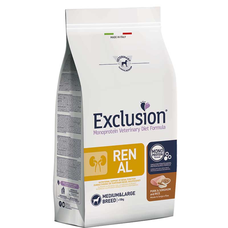 Exclusion Renal Maiale Sorgo e Riso Adult Medium e Large Breed ; Alimento completo dietetico monoproteico per cani di media e grande  taglia con problemi di insufficenza renale cronica o temporanea;