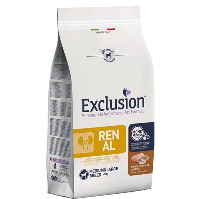 Exclusion Renal Maiale Sorgo e Riso Adult Medium e Large Breed 2kg; Alimento completo dietetico monoproteico per cani di media e grande taglia con problemi di insufficenza renale cronica o temporanea;