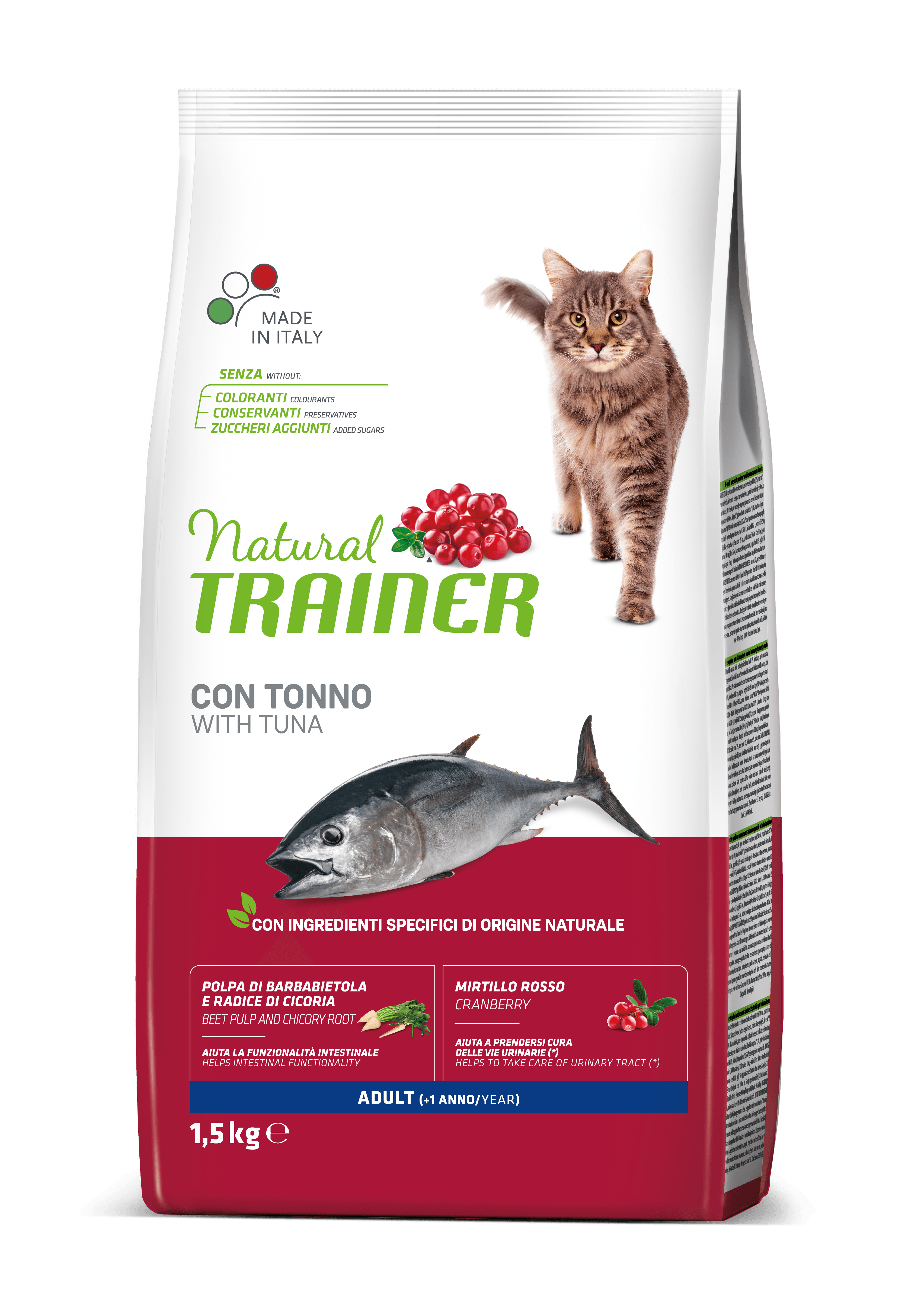 Natural Trainer cat Adult Tonno alimento completo ed equilibrato per gatti adulti, da 1 anno di età.