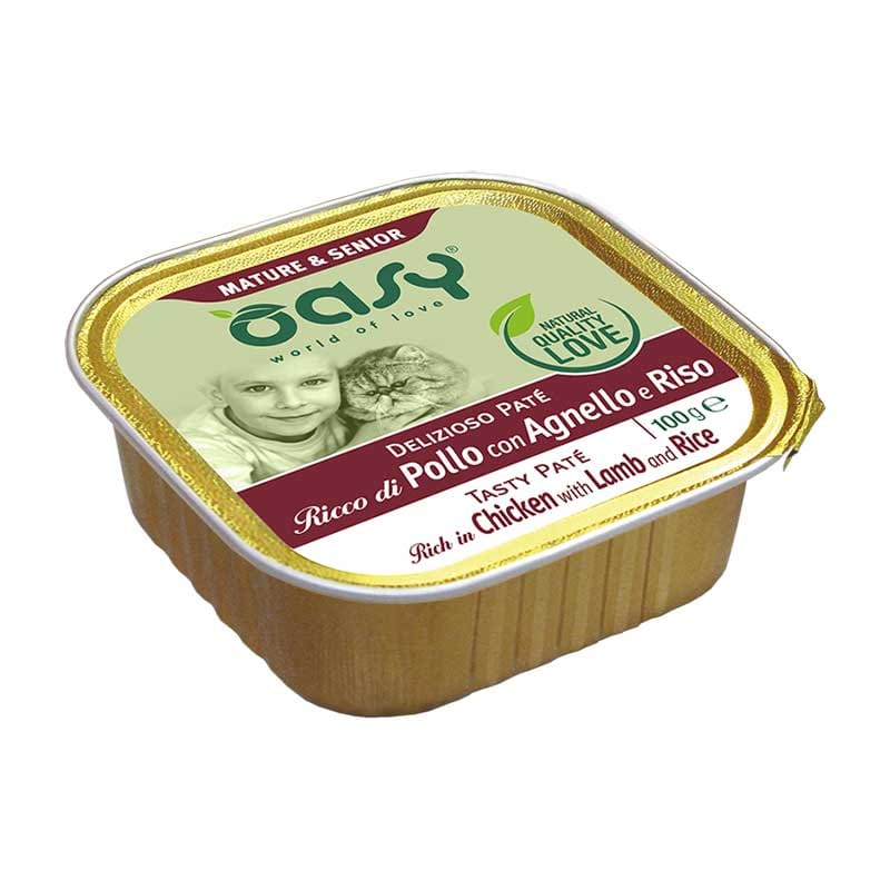 Oasy Delizioso Patè per tutti i gatti in particolare i gatti adulti di 7 anni in poi al gusto di Pollo Agnello e riso da 100gr;