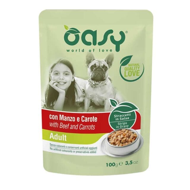 Oasy Straccetti in Salsa Adult Manzo e Carote 100gr;Alimento completo per cani adulti di tutte le taglie al gusto di manzo ;