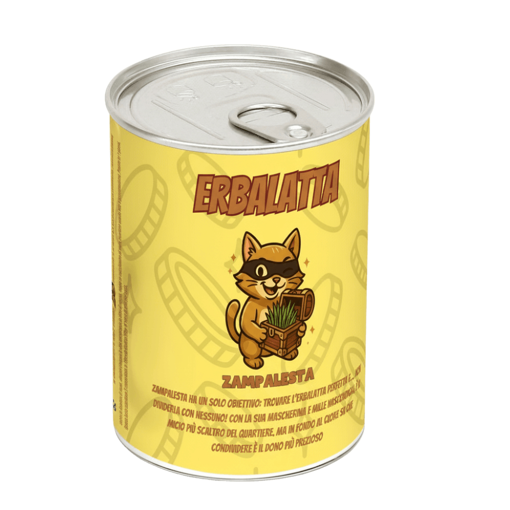 🎩 Zampalesta – Il Ladro GentiluomoCon Erbalatta Zampalesta, la coltivazione dell’erba gatta diventa un gioco da veri intenditori.All’interno: semi d’orzo di alta qualità, substrato di fibra di cocco e barattolo riutilizzabile in alluminio.Il tuo gatto potrà mordicchiare erba fresca e naturale, tu goderti la soddisfazione di vederla crescere in pochi giorni. Perfetta come idea regalo o collezione: ogni latta Erbalatta è un piccolo furto di sorrisi.ISTRUZIONI PER L’USO:1: APRI LA LATTA ED ESTRAI LA BUSTINA DI SEMI ALL’INTERNO2: LASCIA LA MEZZALUNA DI FIBRA DI COCCO ALL’INTERNO E RIEMPI D’ACQUA FINO ALL’ORLO3: DOPO 30 MINUTI SMISTA UN PUGNETTO DI SEMI SERVENDOTI DI UN CUCCHIAINO E PIANTA I SEMI4: DOPO 7 GIORNI CIRCA L’ERBA SARA’ CRESCIUTA! RICORDA CHE I SEMI PRESENTI NELLA BUSTINA SONO IDEALI X5 SEMINE